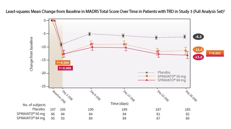 Spravato offers rapid relief, with some patients experiencing improvement within 24 hours, and more pronounced effects by 28 days. Verywell HealthJNJ.comReutersNew York Post